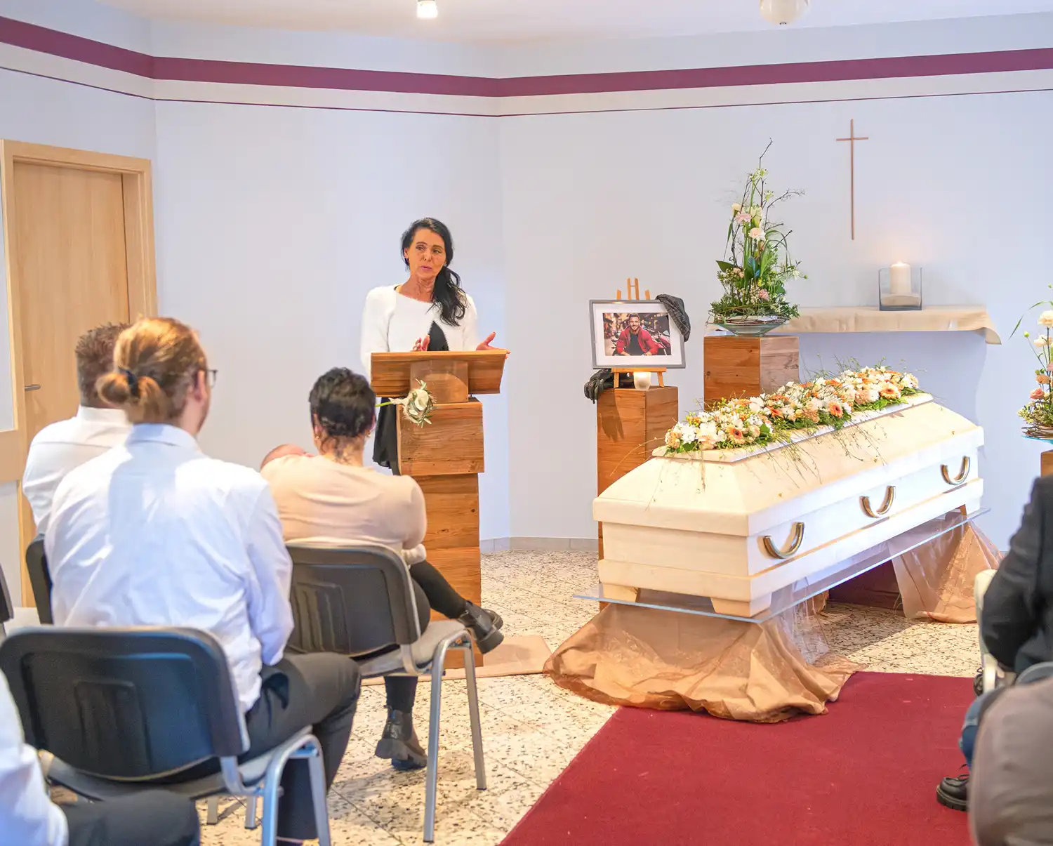 In unserem Raum für den Abschied finden sie beste Bedingungen für eine Feier im geschützten Rahmen und nach Ihren Bedürfnissen. Da der Saal schlicht gehalten ist, kann alles ganz individuell nach Ihren Bedürfnissen gestaltet werden.. Möchten Sie ein Abschiedsritual oder eine besondere Dekoration, die die Persönlichkeit des Verstorbenen widerspiegelt? Sollen Fotos oder Lieblingsgegenstände des Verstorbenen gezeigt werden? Wollen Sie, dass Musik erklingt, um an besondere Momente zu erinnern? Wir sorgen dafür, dass Ihre Wünsche wahr werden. Natürlich gestalten wir aber auch in der Friedhofskapelle eine schöne und individuelle Feier für Sie.